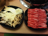 Hidangan shabu shabu ini terdiri dari sepiring daging sapi yang diiris tipis, sepiring aneka jenis jamur (ada 5 jenis), sepiring sayuran, mi, 2 pangsit yang ukurannya gemuk karena isinya yang besar, adonan daging cincang yang bila dimasukkan sedikit sedikit kedalam kuah akan menjadi baso, semangkuk nasi dengan taburan wijen putih, daun bawang serta nori, semangkok telur mentah serta 2 jenis saus pelengkap. Nah rame dan lengkap kan!